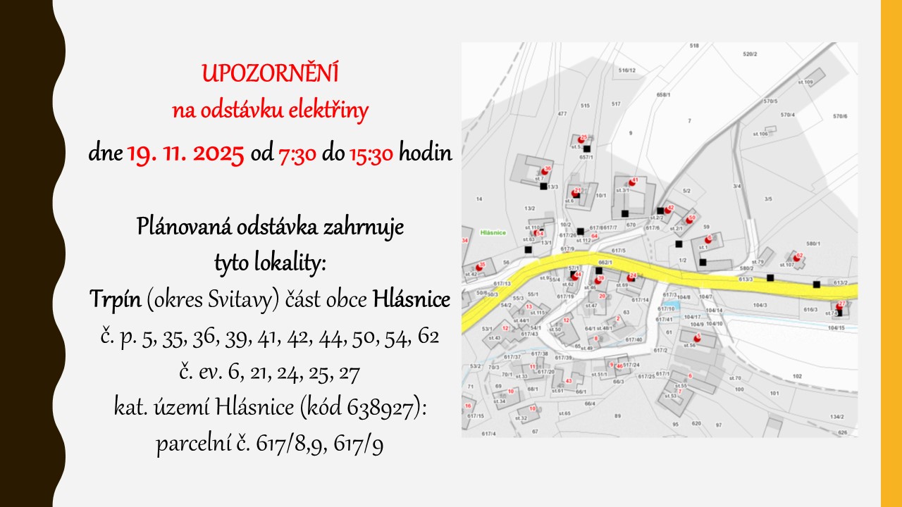 UPOZORNĚNÍ na odstávku elektřiny dne 19. 11. 2025 od 7:30 do 15:30 hodin