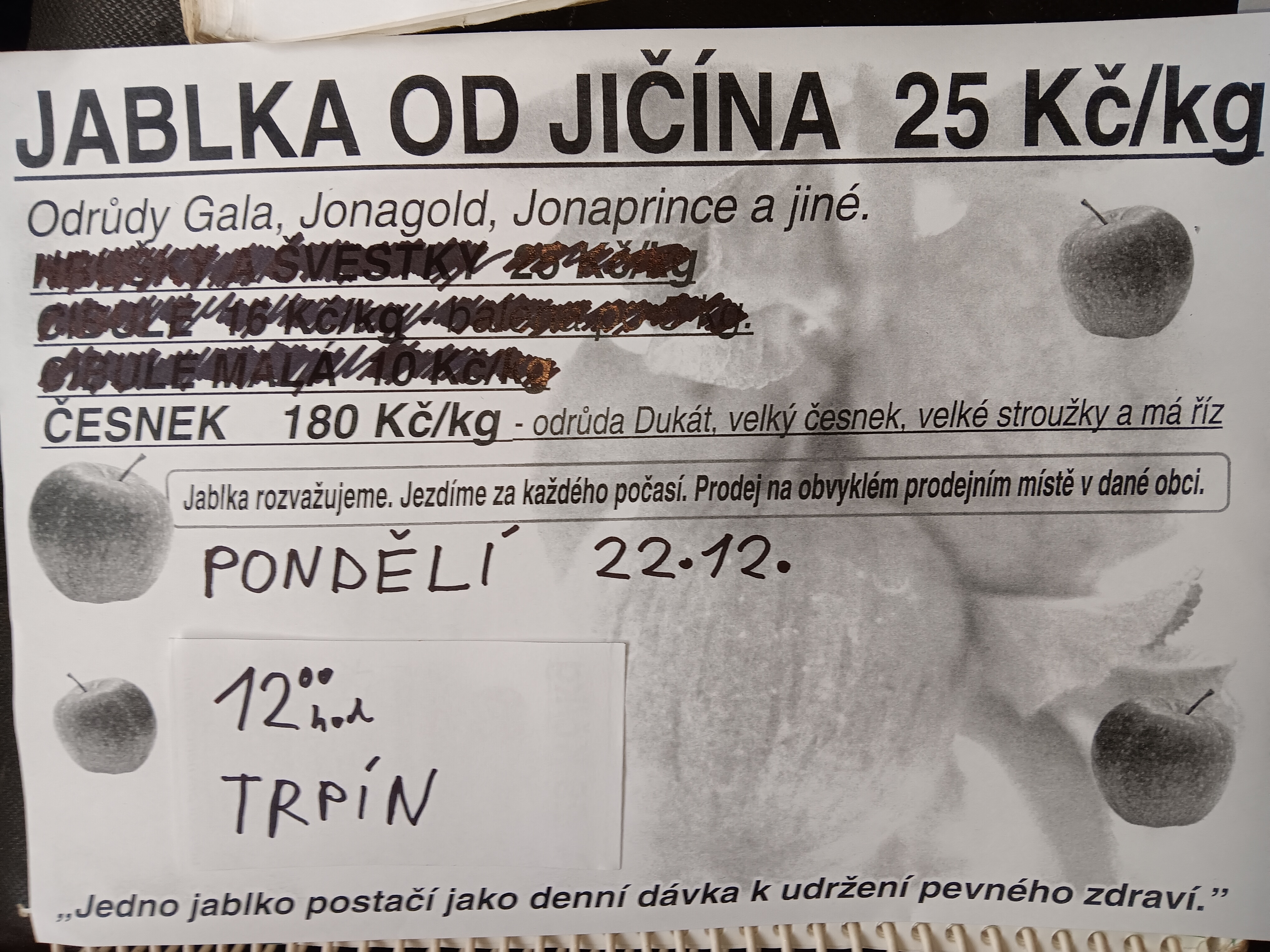 Prodej jablek Prodejce jablek od Jičína bude v pondělí 22.12.2025 ve 12:00 nabízet na před Kozákovými jablka za 25 Kč/kg a česnek za 180 Kč/kg. Přílohy: SouborPopisVelikost souboru jablka.jpg 3287 kB