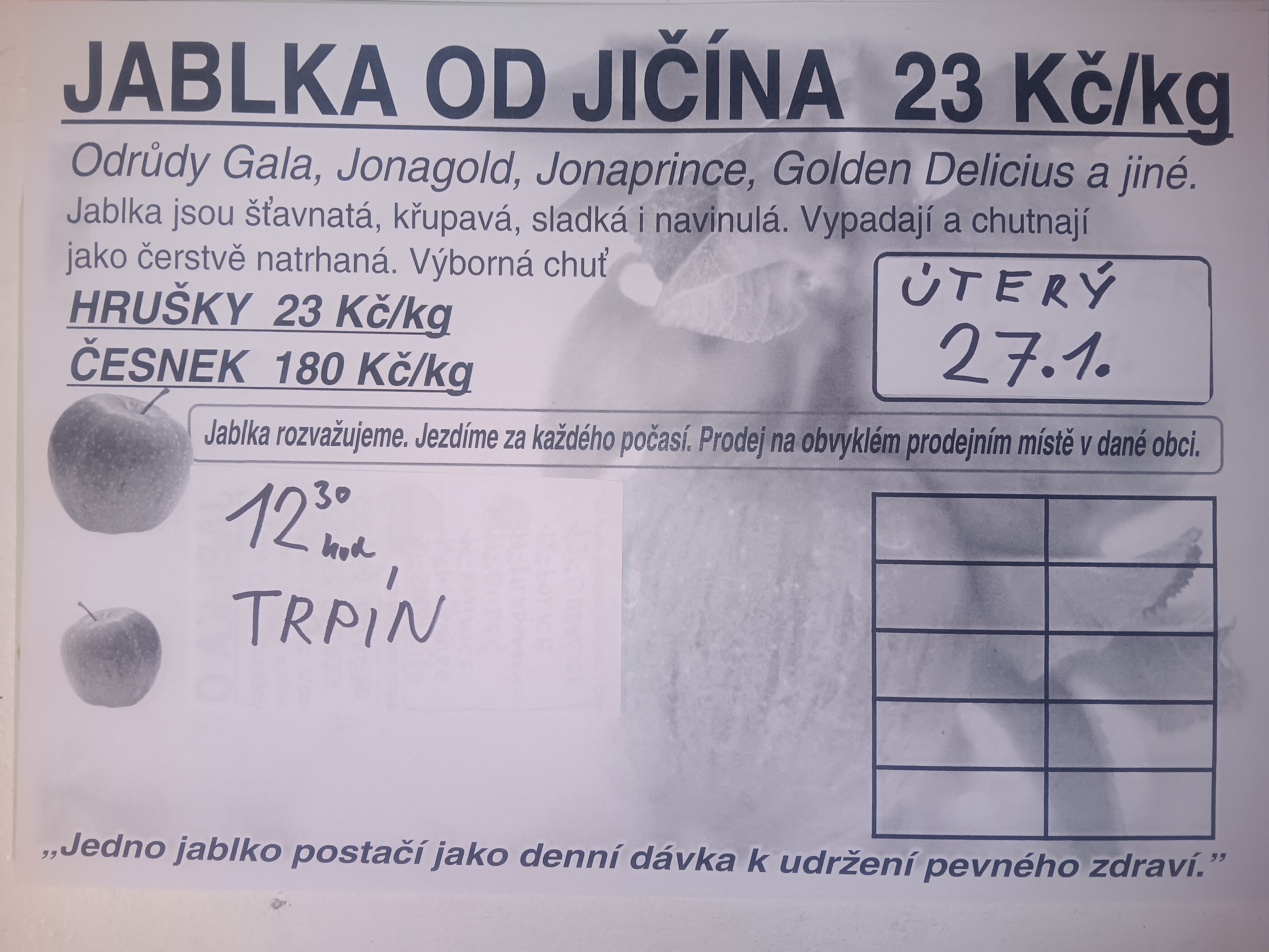Prodej jablek Prodejce jablek od Jičína bude v úterý 27.1.2026 ve 12:30 nabízet před Kozákovými jablka za 23 Kč/kg, česnek za 180 Kč/kg a hrušky za 23 Kč/kg. Přílohy: SouborPopisVelikost souboru Jablka.jpg 2090 kB
