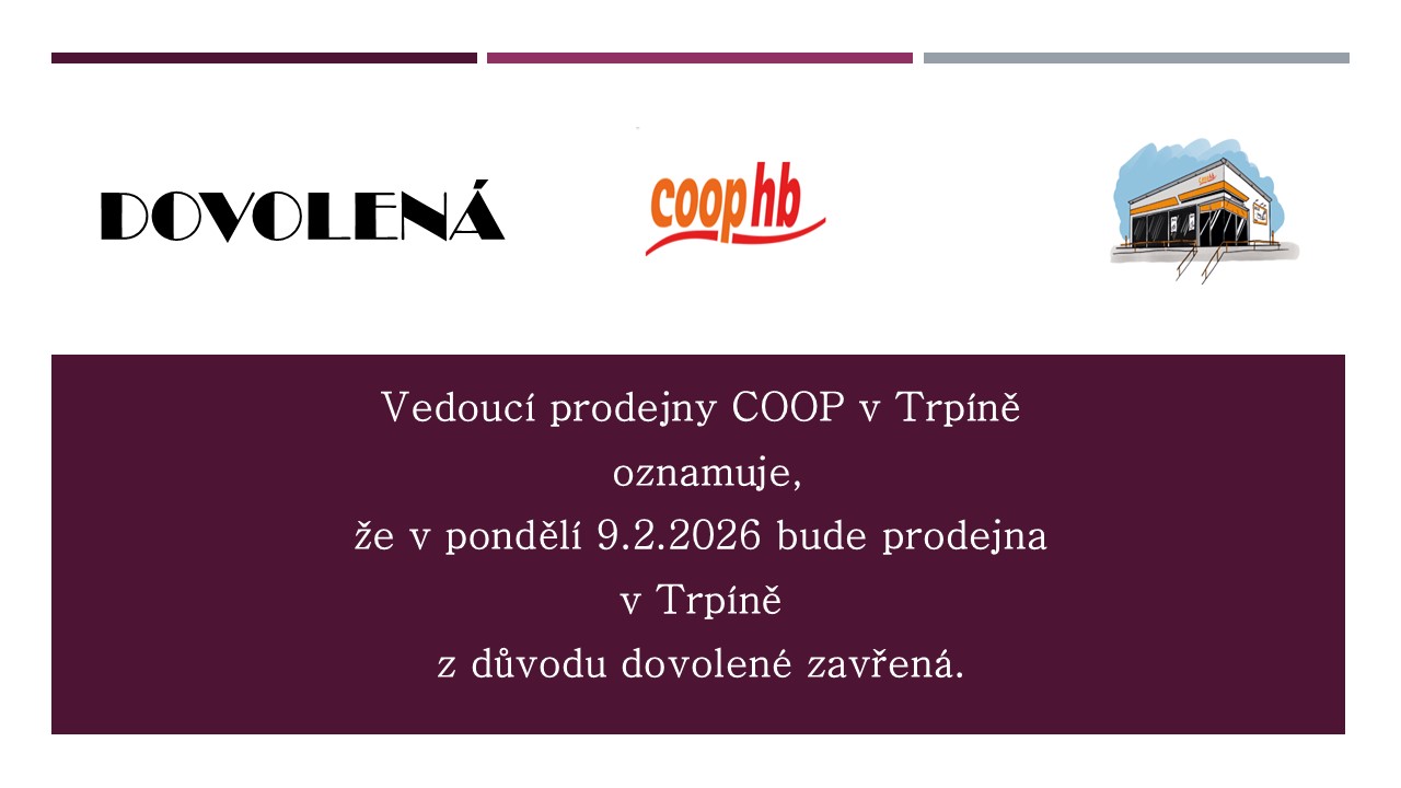 Prodejna COOP - dovolená Vedoucí prodejny COOP v Trpíně oznamuje, že v pondělí 9.2.2026 bude prodejna v Trpíně z důvodu dovolené zavřená. Přílohy: SouborPopisVelikost souboru COOP.jpg 81 kB
