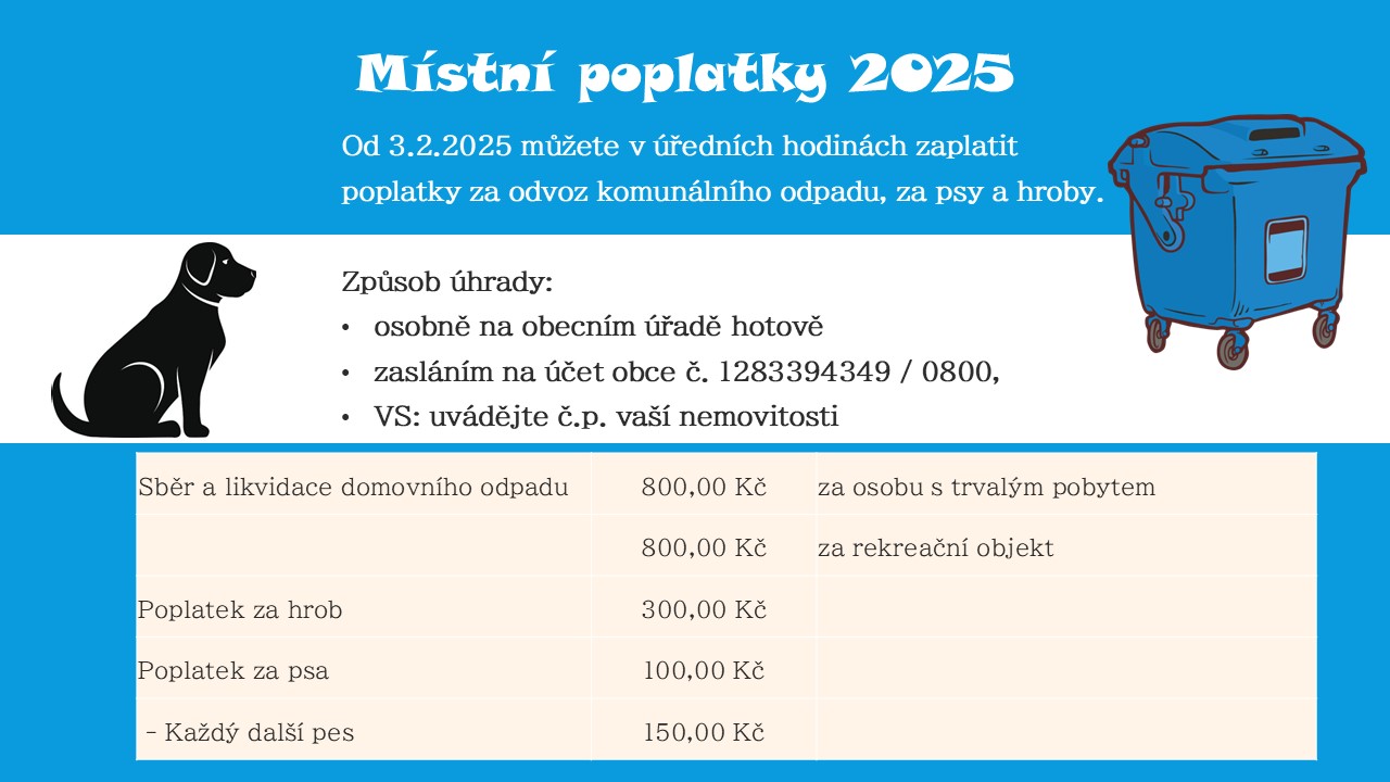 Od 3.2.2025 můžete v úředních hodinách zaplatit poplatky za odvoz komunálního odpadu, za psy a hroby.