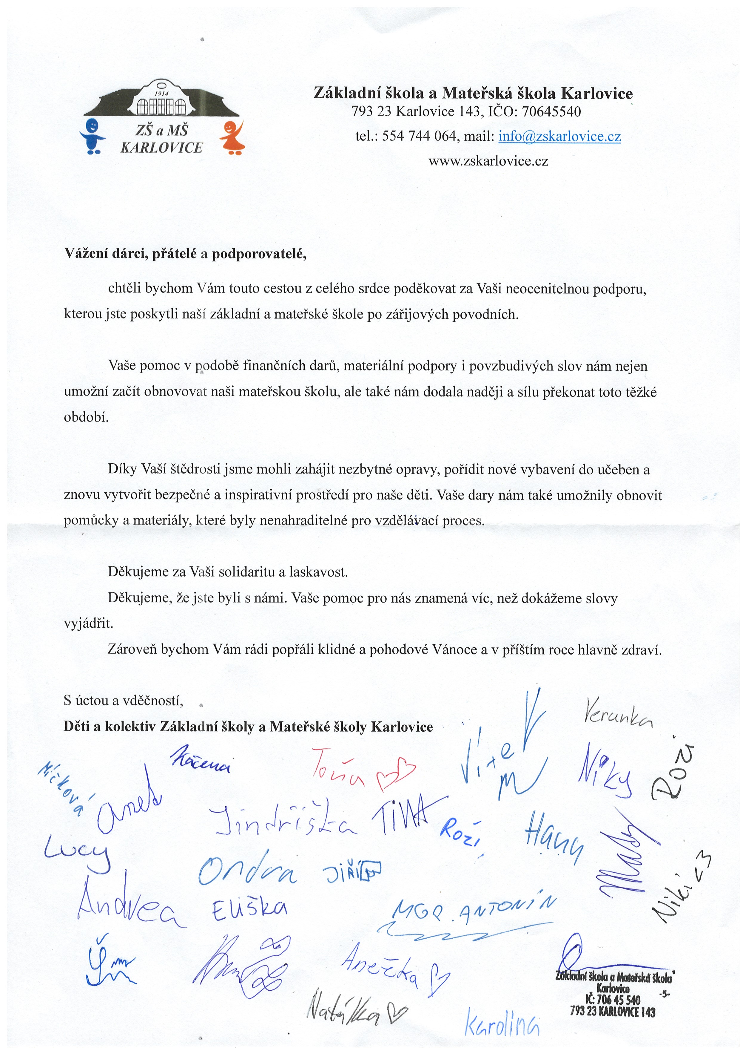 Školka Karlovice - poděkování Školce v Karlovicích byl předán finanční příspěvek, který byl vybrán na charitativním adventním trhu v Trpíně. Toto je poděkování od nich Přílohy: SouborPopisVelikost souboru poděkování.jpg 1475 kB přání.jpg 860 kB