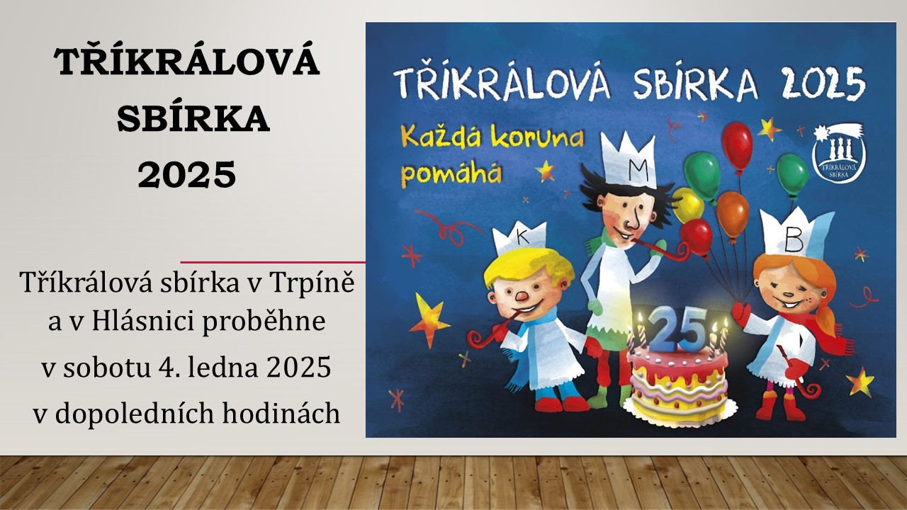 Tříkrálová sbírka 2025 v Trpíně a v Hlásnici Tříkrálová sbírka 2025 v Trpíně a v Hlásnici proběhne v sobotu 4. ledna 2025 v dopoledních hodinách. Přílohy: SouborPopisVelikost souboru Tříkrálová sbírka 2025.jpg 199 kB