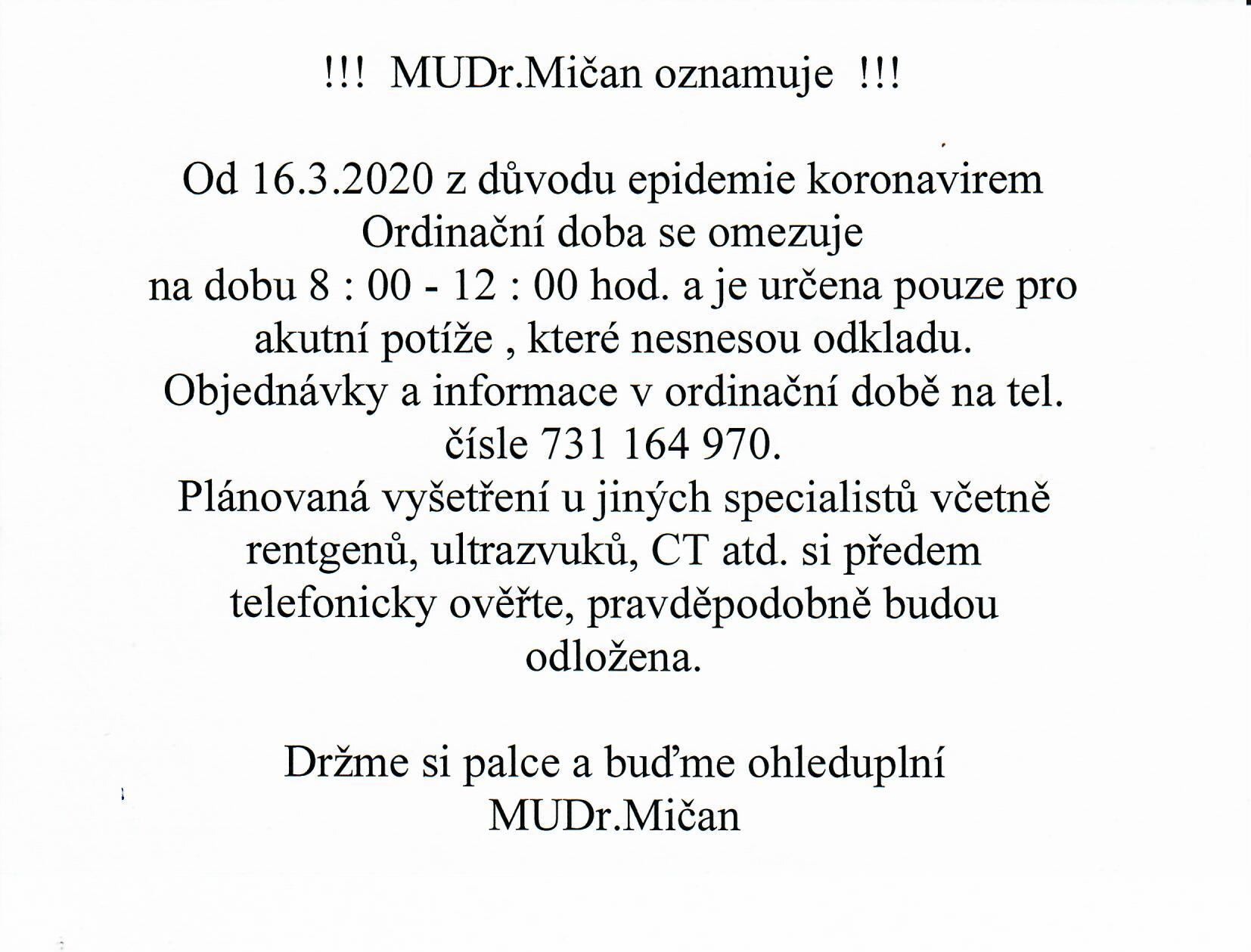MUDr. Mičan - oznámení o změně ordinační doby . Přílohy: SouborPopisVelikost souboru MUDr. Mičan - oznámení o úpravě ordinační doby.jpg 180 kB